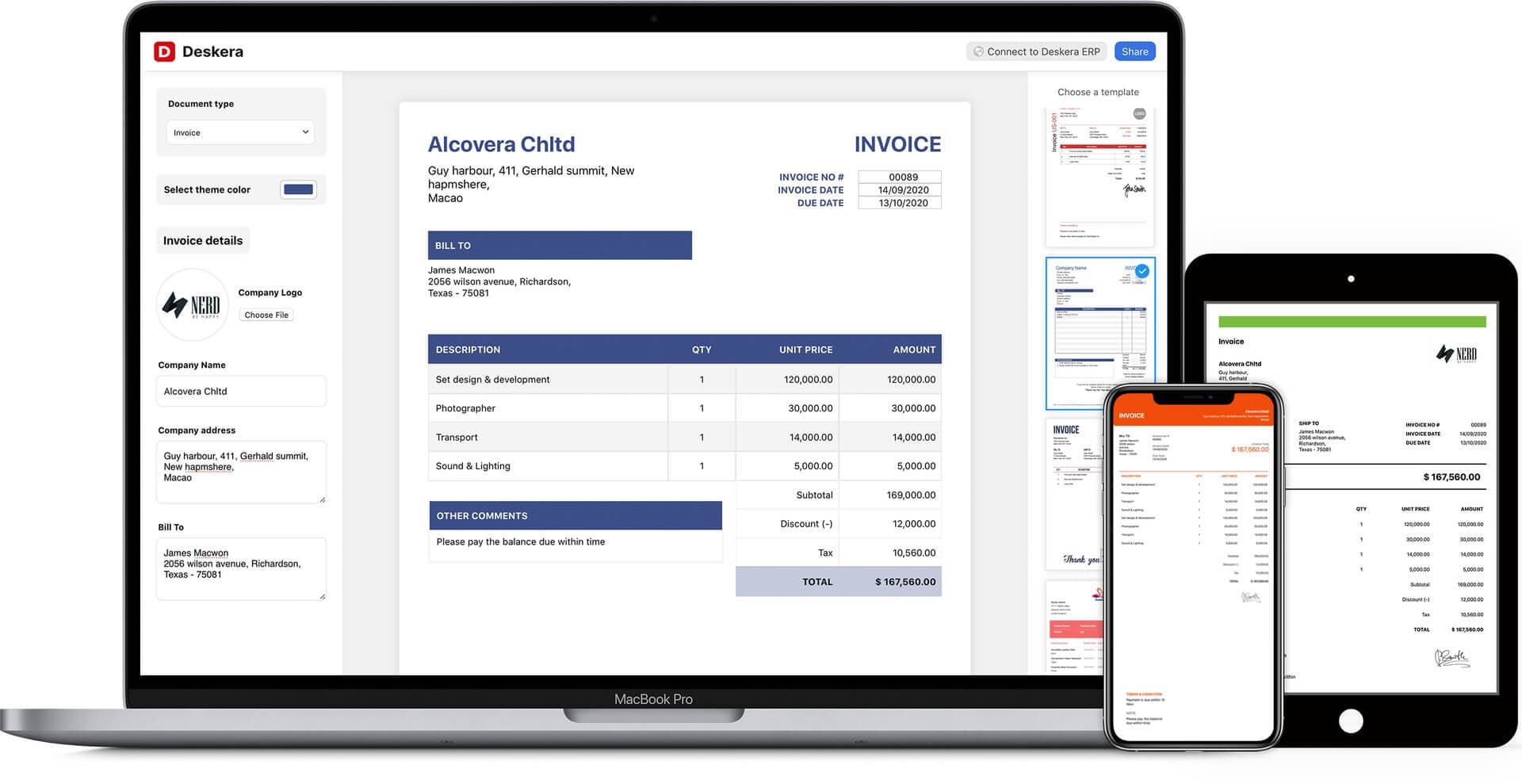 Send invoices you’re proud of. Deskera makes it easy to create and send professional, beautiful invoices. Start with invoice templates, add your logo and branding, and you’re good to go.