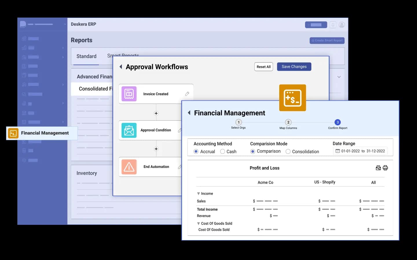Automations make it easier to record, monitor and analyze data, while Bank Reconciliation automates your bank reconciliation process. Multi-Entity Consolidation allows you to view, analyze and report on multiple entities in one dashboard. Approval Workflows help you keep track of financial approvals and Financial Reports enable you to quickly generate financial statements. With Deskera, you can take control of your finances.