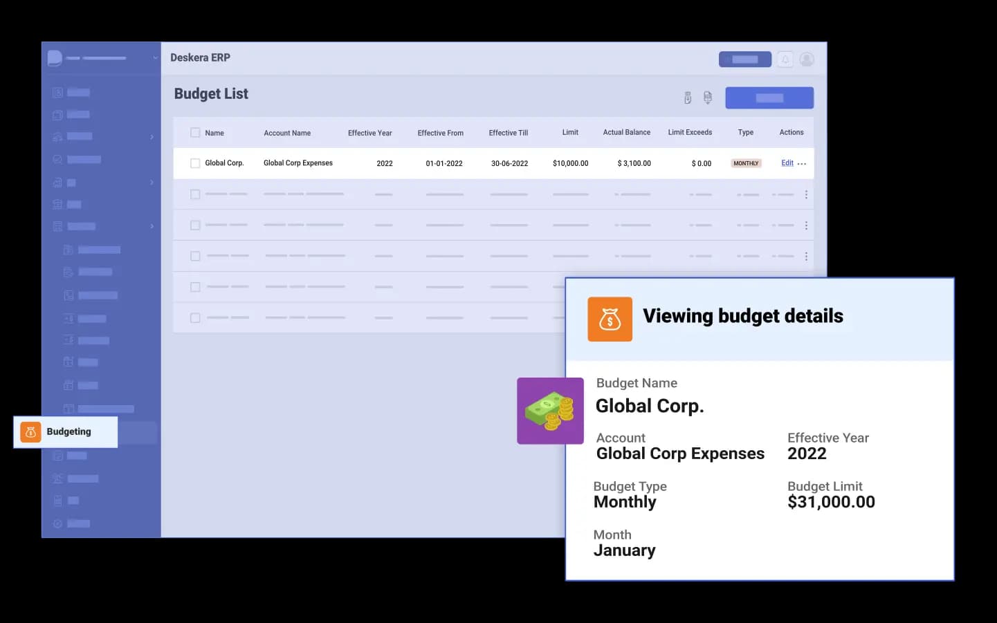 Deskera ERP's Budgeting and Forecasting enables finance teams to effectively manage their finances and plan for the future. Finance teams can quickly and easily forecast future cash flows, revenues, expenses, and profits, and set up and track budgets and financial plans, analyze financial data, and generate accurate financial reports.