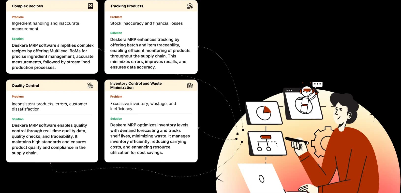 Deskera manufacturing software elevates food manufacturing with quick implementation, operational excellence, supply chain control, waste minimization, and automation for transparent workflows.