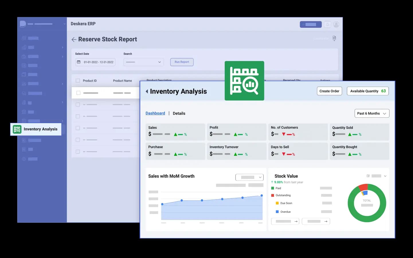 Deskera ERP allows you to streamline your inventory management and improve overall efficiency. You can easily track and manage inventory, set up alerts for stock levels, optimize product lifecycles, plan and forecast orders, create and manage multiple warehouses, generate real-time reports and get an overview of your entire inventory system.