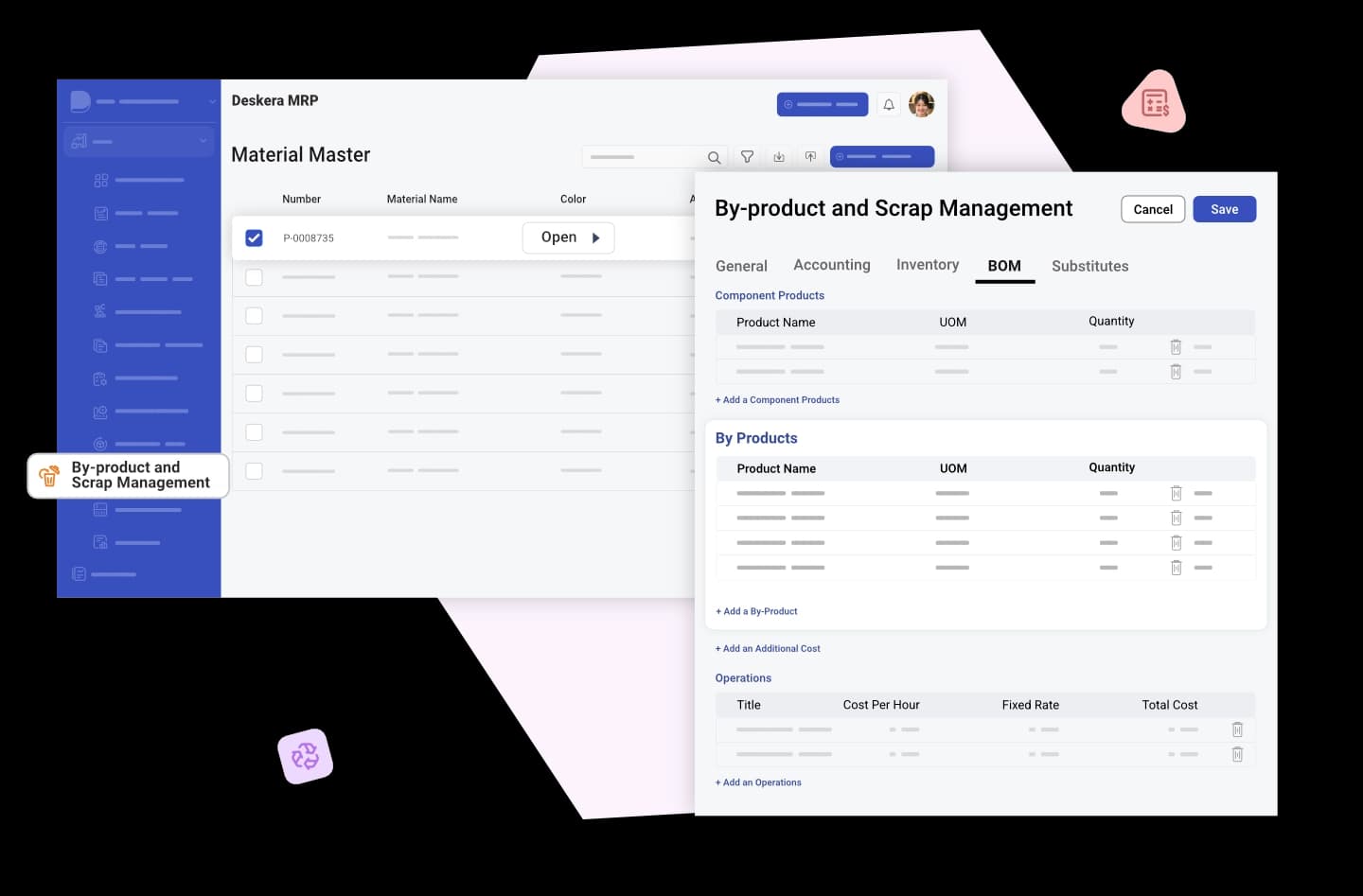 Keep track of the production of by-products and scraps with their associated costs and profits, and ensure that they are correctly accounted for in inventory. Monitor and track their use in production processes, or their sale as a finished product.