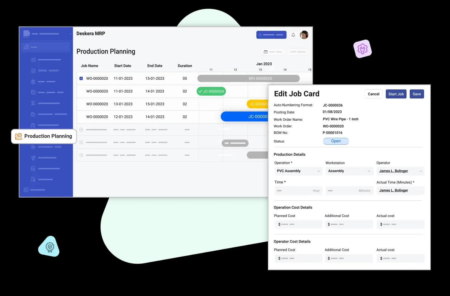 Create production plans with ease. Assign resources, set schedules and deadlines.