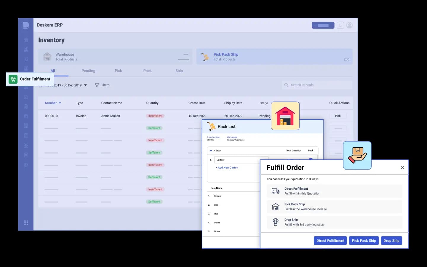 Deskera Order Fulfillment provides inventory managers with a comprehensive suite of tools to facilitate the entire order fulfillment process. With Dropship, they can easily manage orders from suppliers and quickly ship the products to customers. Pick Pack Ship allows them to quickly sort and pack items for shipment, ensuring that orders are processed and shipped accurately and efficiently. Shipment Tracking gives inventory managers the ability to track orders from start to finish, enabling them to monitor the status of deliveries and quickly respond to customer inquiries.