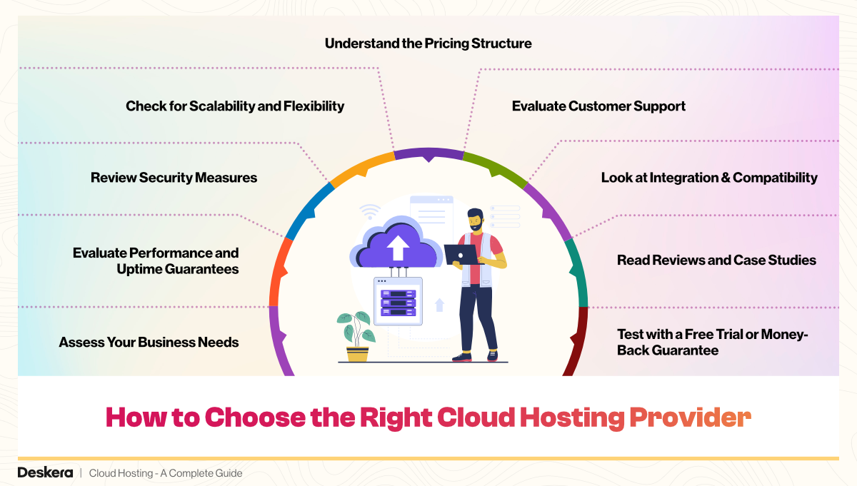- When selecting a cloud hosting provider, evaluate factors like performance, scalability, security, compliance, pricing, and support to ensure alignment with your business goals.